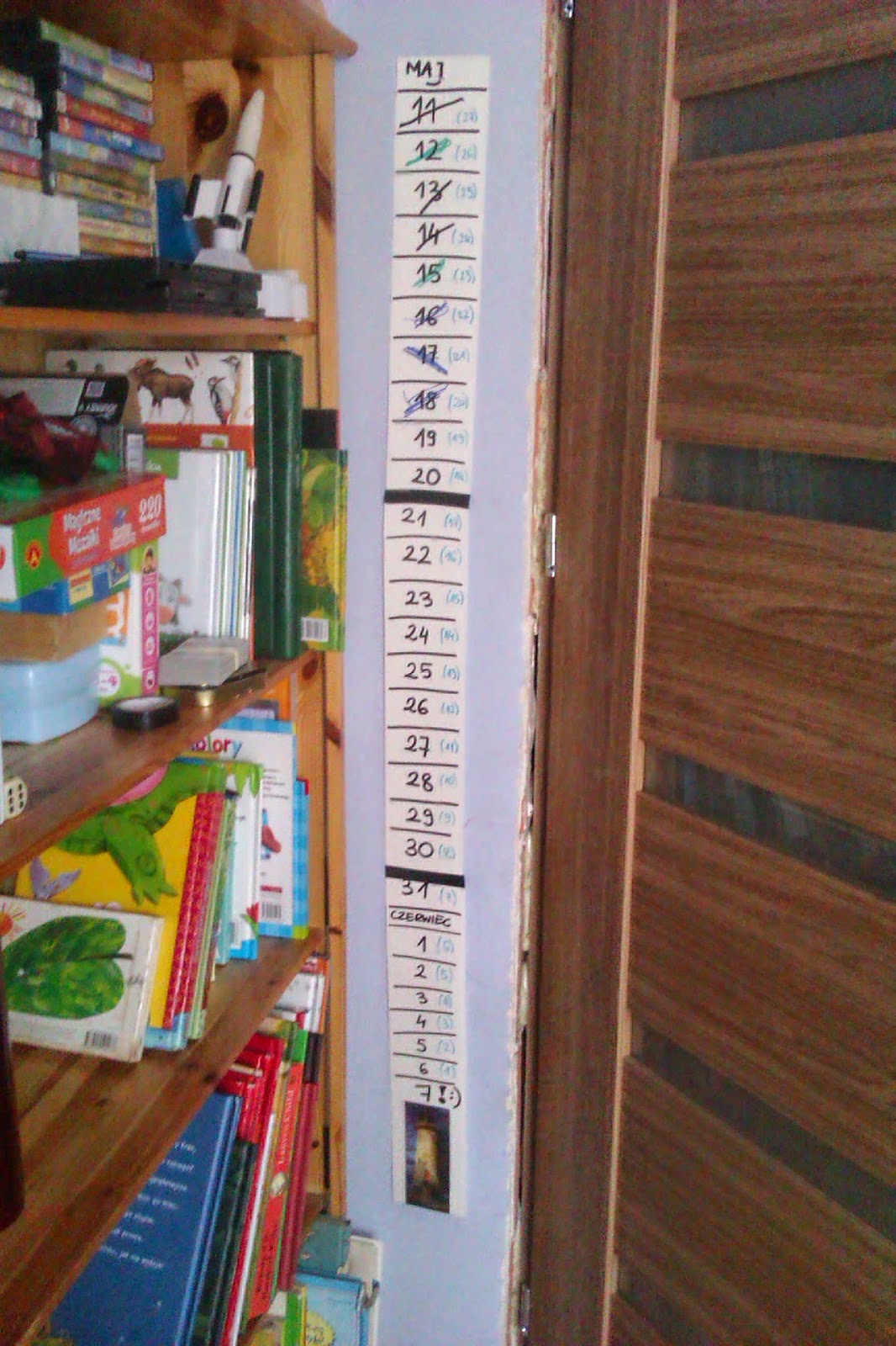 Robcio dowiedział się (niestety dla nas ;), że pojedziemy w czerwcu nad morze. Ponieważ był w zeszłym roku i pamięta jak było super, zamęczał nas przez 2 dni przepotwornie czy już jedziemy, czy zaraz, czy już się może pakować, czy już jak się wyśpimy to jedziemy i tak w kółko... koszmar... Zrobiliśmy więc sobie tablicę do skreślania dni i odliczania ile jeszcze. Dzięki temu, przed spaniem skreślamy i widzimy ile już zaznaczyliśmy i czy długo jeszcze. Również w ciągu dnia, kiedy Robas zaczyna swoje pytania, mówię mu, żeby poszedł i sprawdził sobie na tablicy czy to już. Nie umie liczyć jeszcze ale widzi, że mamy sporo nie zaznaczonych kratek. I nie marudzi. Polecam takie rozwiązanie. Podobne stosowaliśmy z rodzicami, kiedy brat pytał bez przerwy o dobranockę, czy już, ale czy zaraz, czy można włączyć telewizor... i tak w kółko. Napisaliśmy mu kartkę z cyfrą 19 (identycznie jak na zegarku elektronicznym kuchenki) i przestał pytać. Nie znał cyfr, ale porównywał sobie i wiedział, że jak się pojawi na wyświetlaczu taka sama cyfra, można włączać. Takie rozwiązania na prawdę ułatwiają życie...